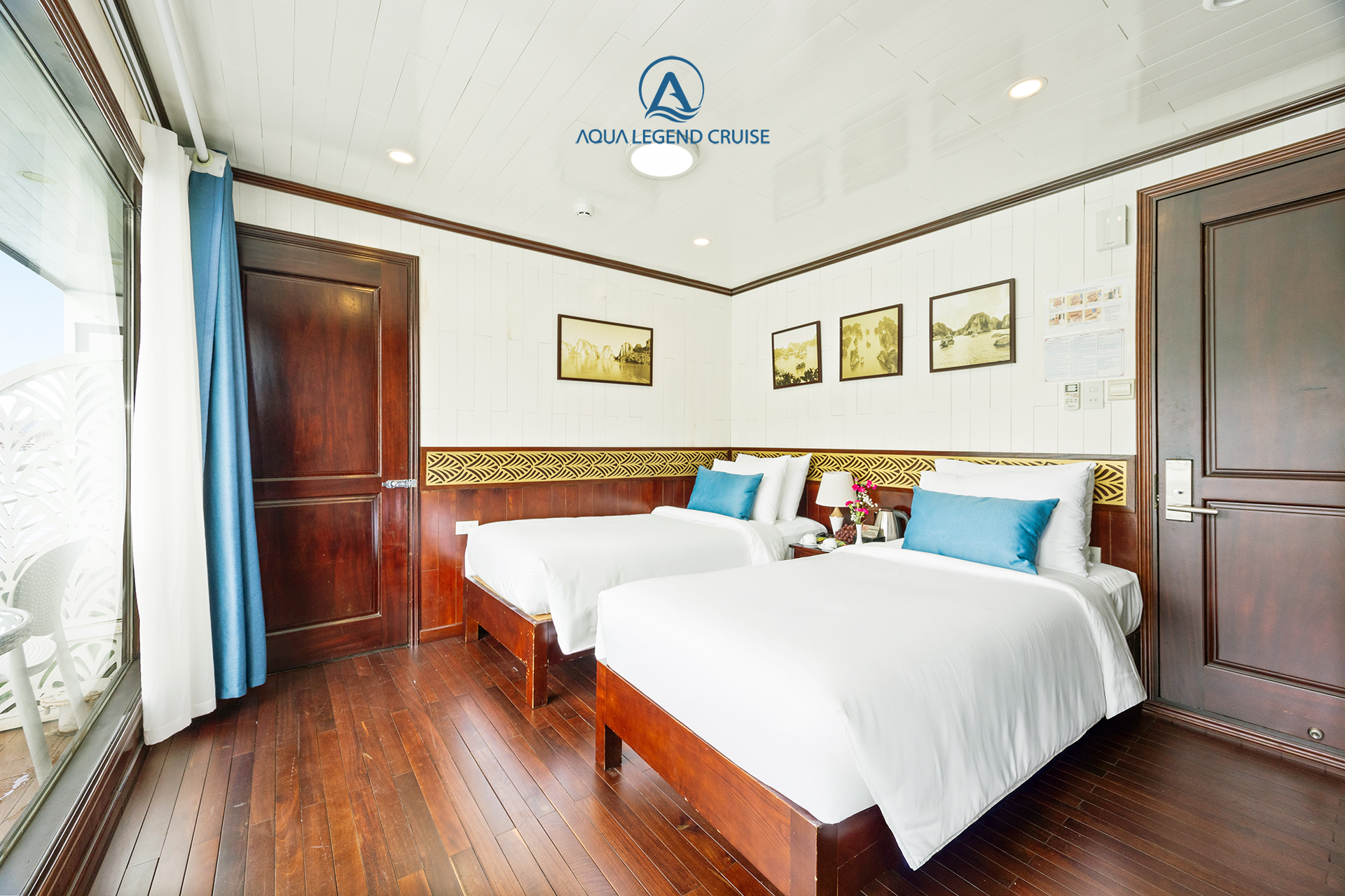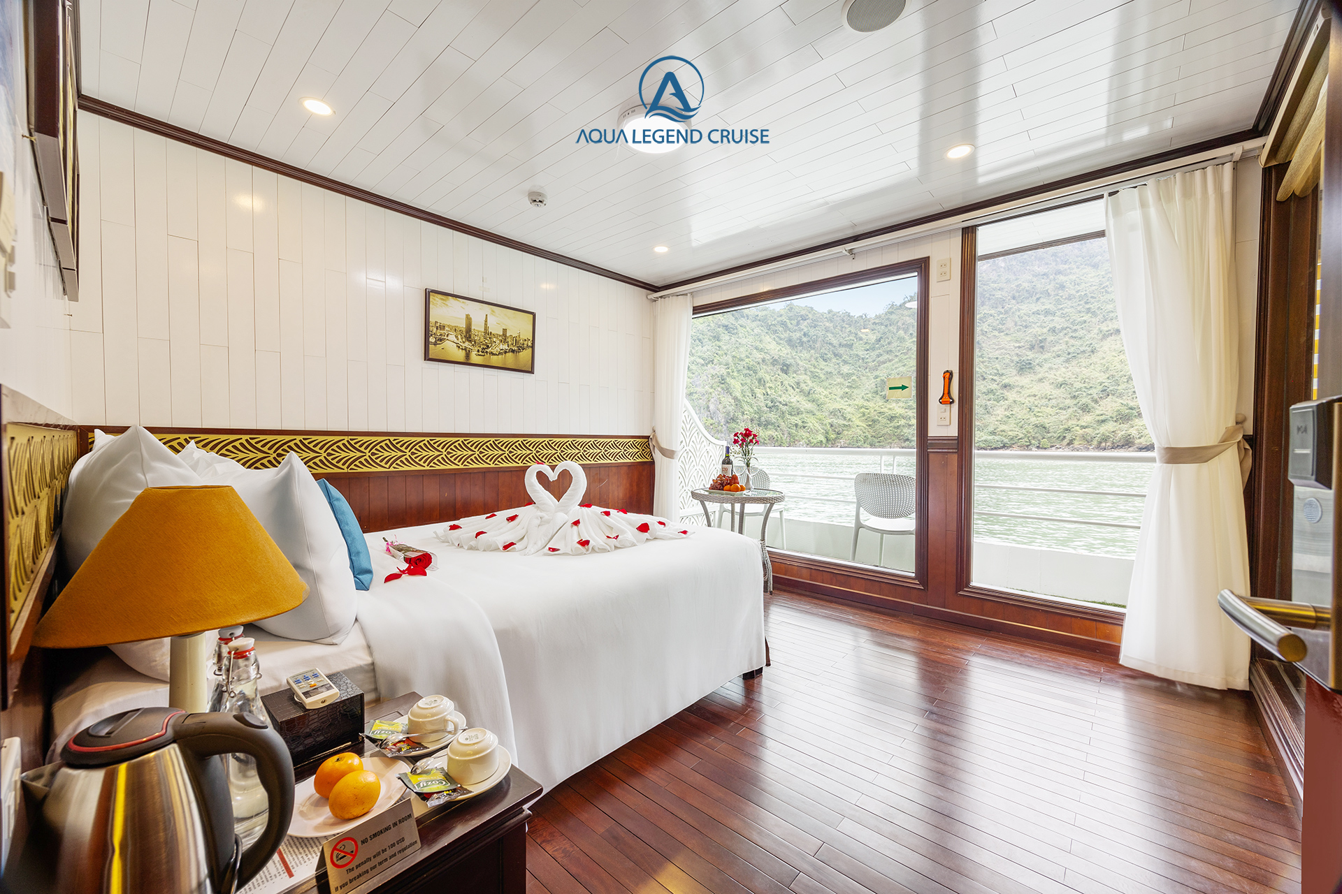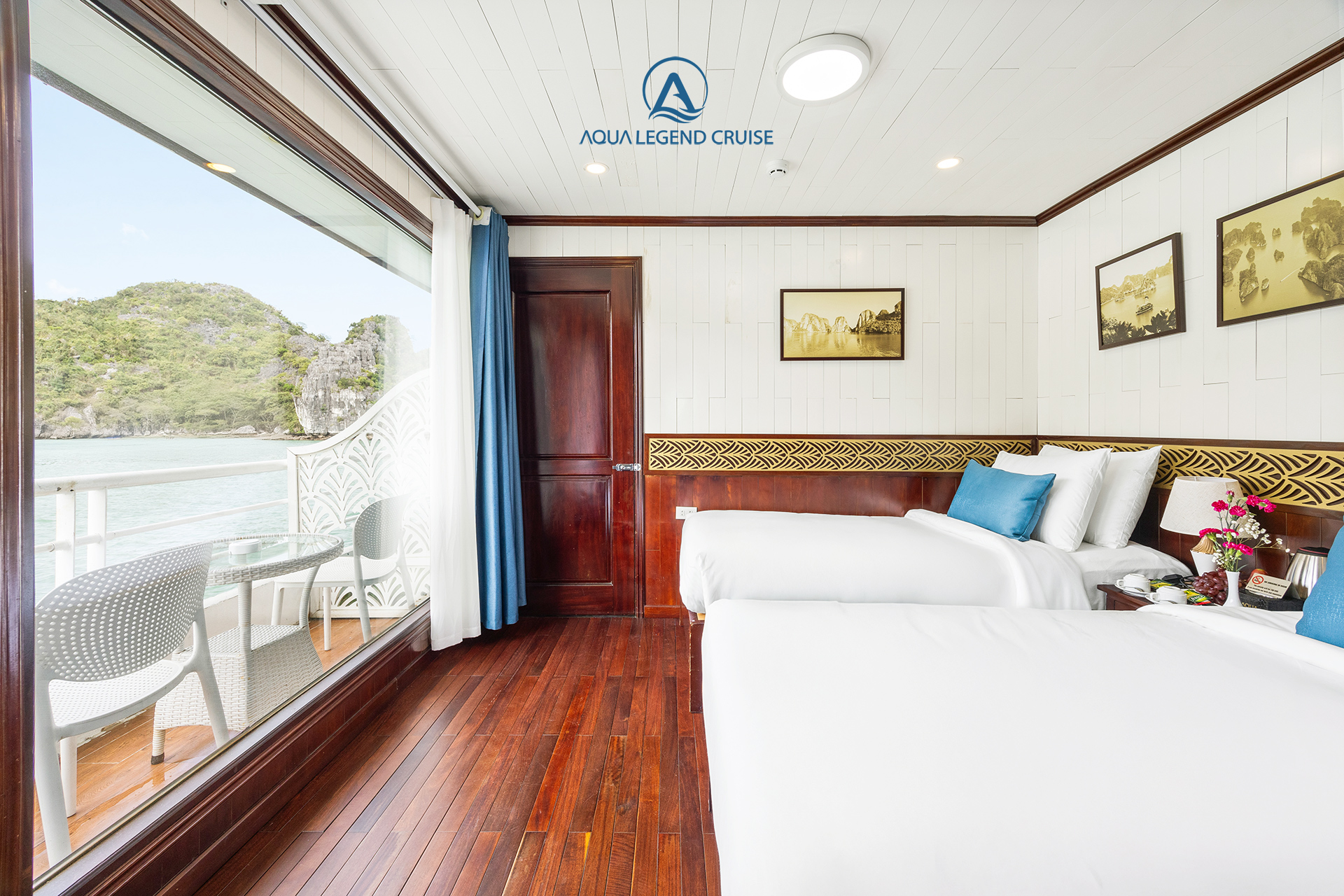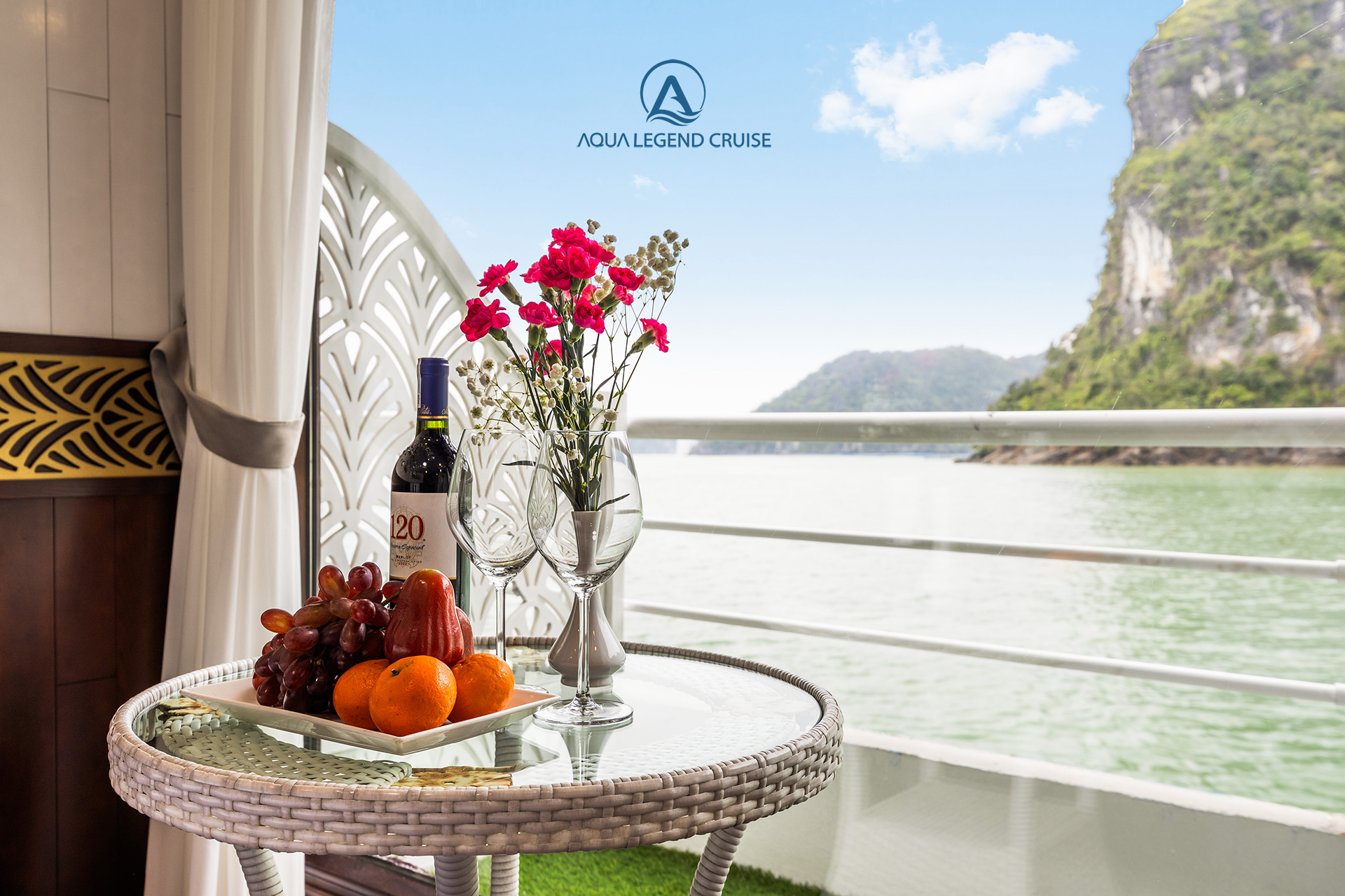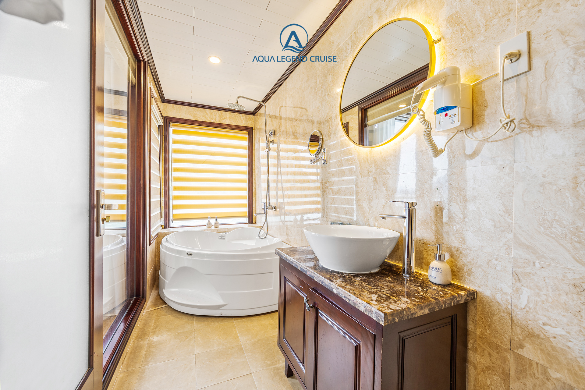 Aqua Senior Suite Balcony Cabin aboard Aqua Legend Cruise offers a luxurious and spacious retreat, located on the second deck of the cruise. Each cabin features a generous 28-square-meter layout, thoughtfully designed to maximize comfort and relaxation. With a private balcony and large glass windows, guests can enjoy breathtaking panoramic views of the bay from the comfort of their own cabin. In addition, a premium Jacuzzi bathtub enhances the experience, providing moments of ultimate relaxation throughout the journey.